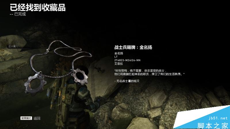 战斗结束后继续前进,会来到墓地外,不要急着进入,在墓地对面有辆破车,破车后面拾取【收藏品:战士兵籍牌-金名扬】。
