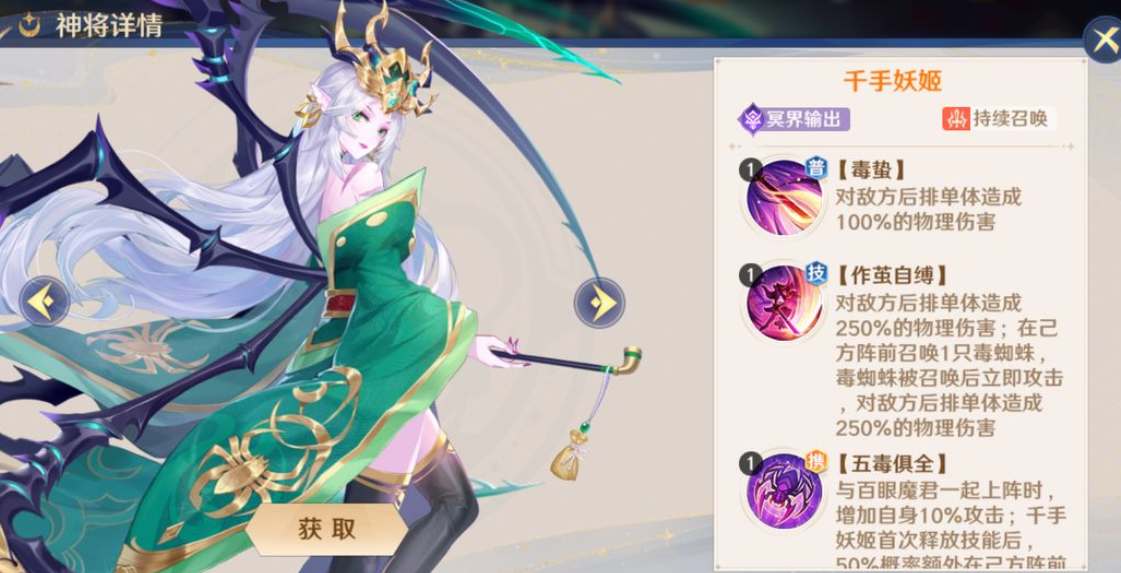 2、召唤流的核心角色是千手妖姬,阵容配置为:黑无常+白无常+百眼魔君+千手妖姬+白小鼠+主角;