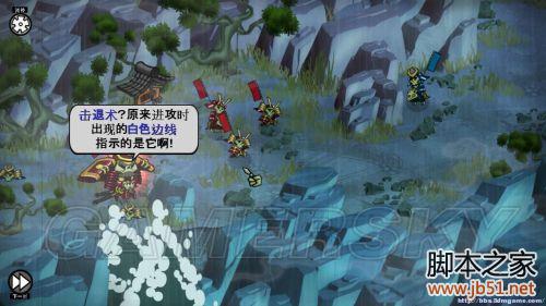 回合1.第一步,使用赤本将军攻击悬崖边上的那名士兵,不费吹灰之力就把他推下悬崖了(这就是传说中的击退技,在攻击时出现白色变线就可以发动击退技);第二步至第四步都是让骑兵与两名步兵靠近敌方骑兵,但因为敌方骑兵躲在岩石之后,只有我方的骑兵才能对其作出攻击,其他步兵靠近后进入稍息状态。