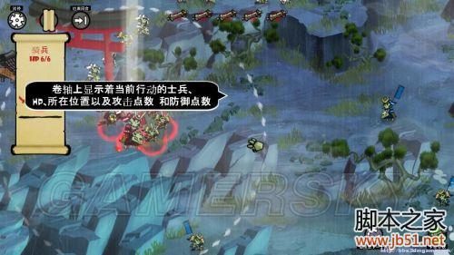 回合1.一开始游戏会简介一吓如何阅览士兵卷轴。然后我们可以留意到敌人大概就只有3名,一人躲藏在屏幕下方岩石后,我方与敌方都保持比较远的距离。第一步是让五名士兵都站成一排以形成灵墙。