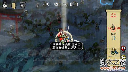 回合3.这时会出现死掉的敌方头骨,控制士兵过去吃头骨,可以回血和增加攻击力,但是每一次吃头骨都会消耗掉一个将军令(吃下头骨的士兵周遭会盘旋一颗头骨,如果吃下3颗就会会环绕3颗头颅)。其余士兵上前与吃头骨的士兵站成一排,以灵墙为前行推进方式。
