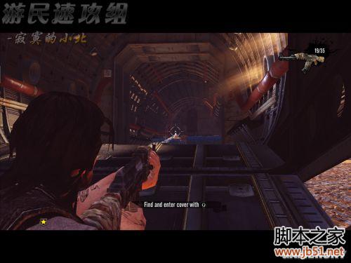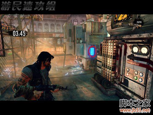 遇到了一个电击路障,只要用枪射击上图中发着蓝光的东东就可以将其破除。