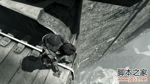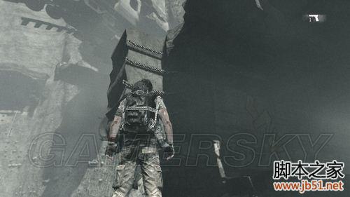 从这里下去,右侧边缘有很多支撑点,中途注意用挂钩休息。挂钩发动点都是可以重复使用的,所以可以利用这个特点搜集物资。