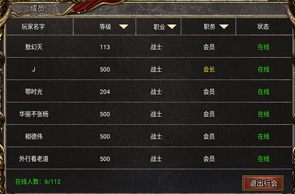 我们在成员界面查看会里的兄弟,最上面一排可以进行筛选,帮助各位了解会里的职业分布,以及等级情况