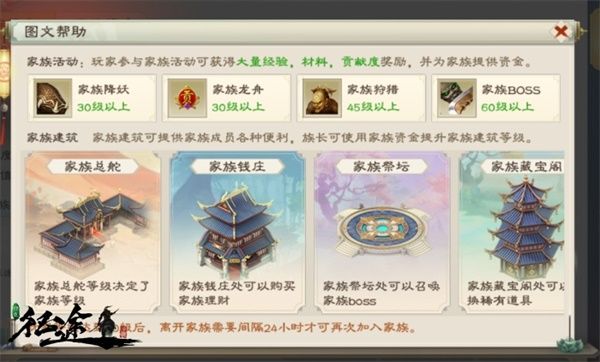 在加入家族之后,可以参与更多家族玩法,家族活动有家族狩猎、家族降妖、家族BOSS和家族龙舟,都需要30级以上才可以参加。