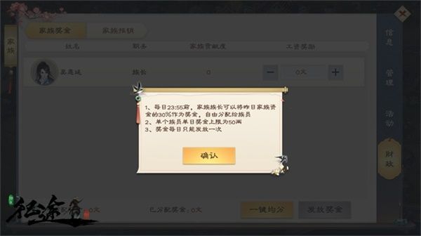 而且,每日23:55前,家族族长可以将昨日家族资金的30%作为奖金发给家族成员,每个人最多单日发50两~