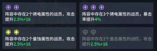 在每场作战队伍当中,一个队伍同属性角色,达到一定数量的时候,那么便可以获得相应的增益buff。通常情况下,一般队伍当中有三位或者两位同属性队伍就能获得非常强力的buff,因此,今天给大家带来的队伍组合是一个非常经典的3+2组合,以电属性队伍附加两个辅助为主的雷队。角色组成有,卡兰丽莎、泠、艾可、燕鸥、莉丽拉。