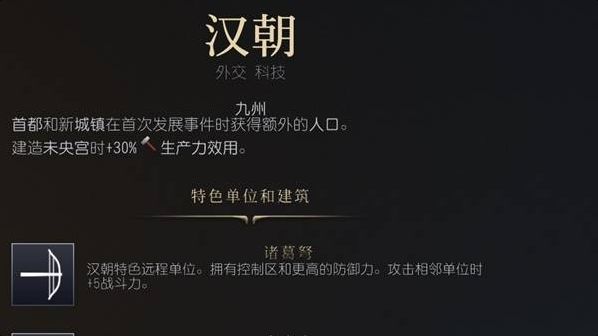 汉朝特色远程单位,拥有控制区和更高的防御力,攻击相邻单位时+5战斗力。