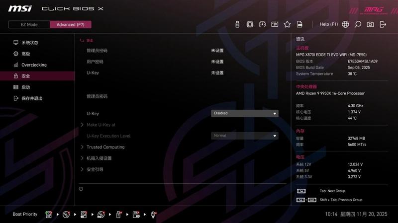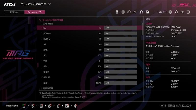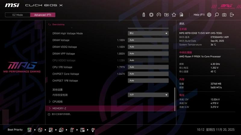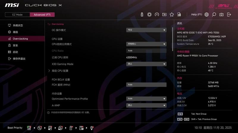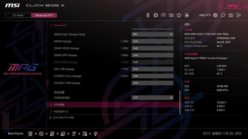 微星MPG X870I EDGE TI EVO WIFI 刀锋 钛主板BIOS中的超频页面,提供了极为详尽的超频设置选项,方便超频玩家对系统性能进行精细的调整,充分发掘性能潜力。