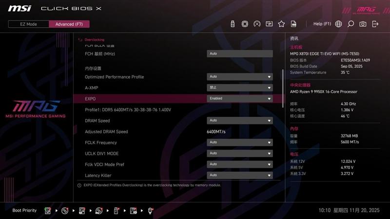 在内存设置中,也可以找到EXPO设置开关,功能和EZ模式下的完全一致。