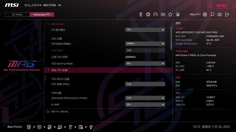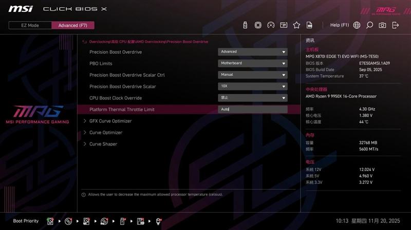 PBO Limits设置为主板,由微星MPG X870I EDGE TI EVO WIFI 刀锋 钛主板对CPU进行控制,可以最大限度释放