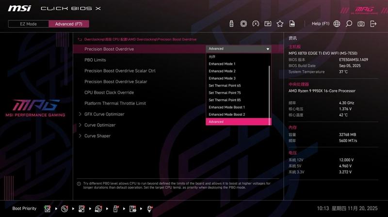 如果在刚进入BIOS时选择了启用PBO(PBO Enable),在这里的PBO功能设置为Advanced模式。