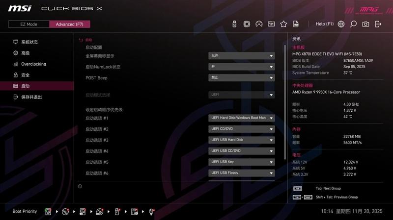 启动页面中可以对启动顺序等设置进行更详细的设置。