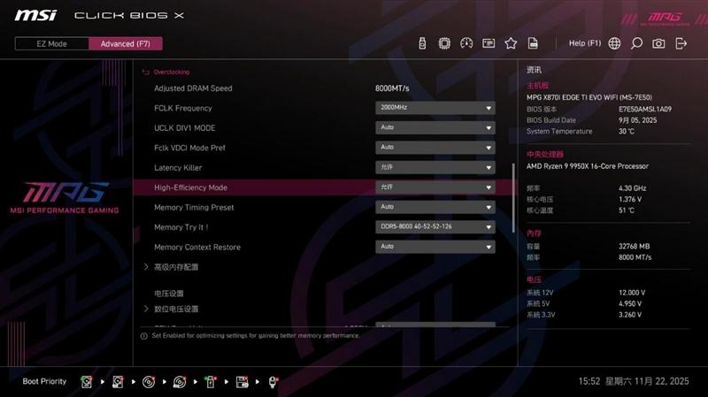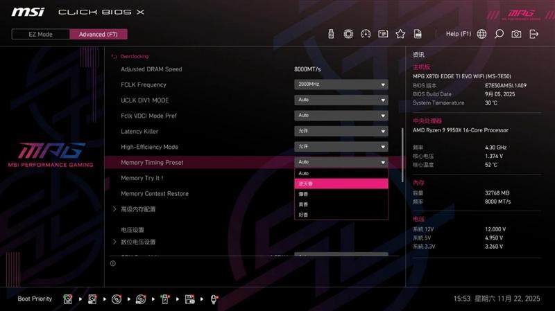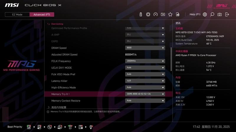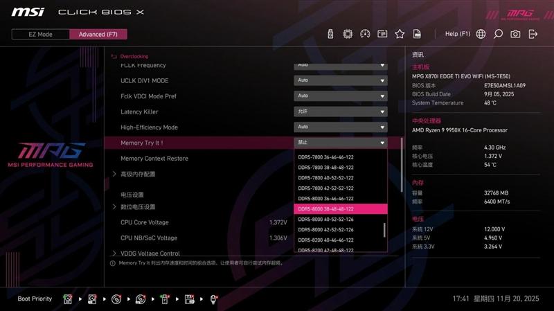 微星MPG X870I EDGE TI EVO WIFI 刀锋 钛主板的Memory Try It!功能和高性能模式配合,用起来更方便安全,远比超频玩家手动设置频率和时序更容易操作,普通用户也可以根据自己的内存体质,尝试发掘内存条的超频潜力,释放出更强的性能。
