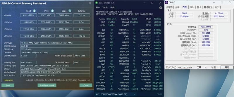 最后我们使用微星MPG X870I EDGE TI EVO WIFI 刀锋 钛主板BIOS中的Memory Try It!中将内存工作频率手动设置到DDR5-8000,时序设置为40-52-52-126,之后再次进行内存测试。此时内存读写拷贝速度分别为83229MB/s,95253MB/s,79139MB/s,延迟为71.3ns。