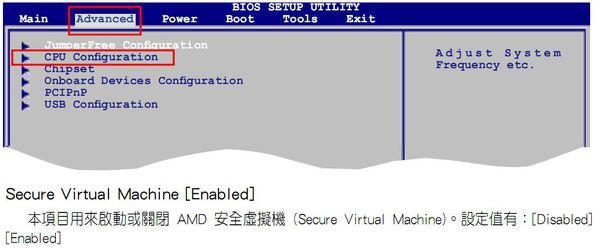 2) 如下图,按以下路径找到“Advanced”——“CPU Configuration”——“Secure Virtual Machine” (或者叫SVM Mode),然后把“Disabled”修改为“Enabled”。