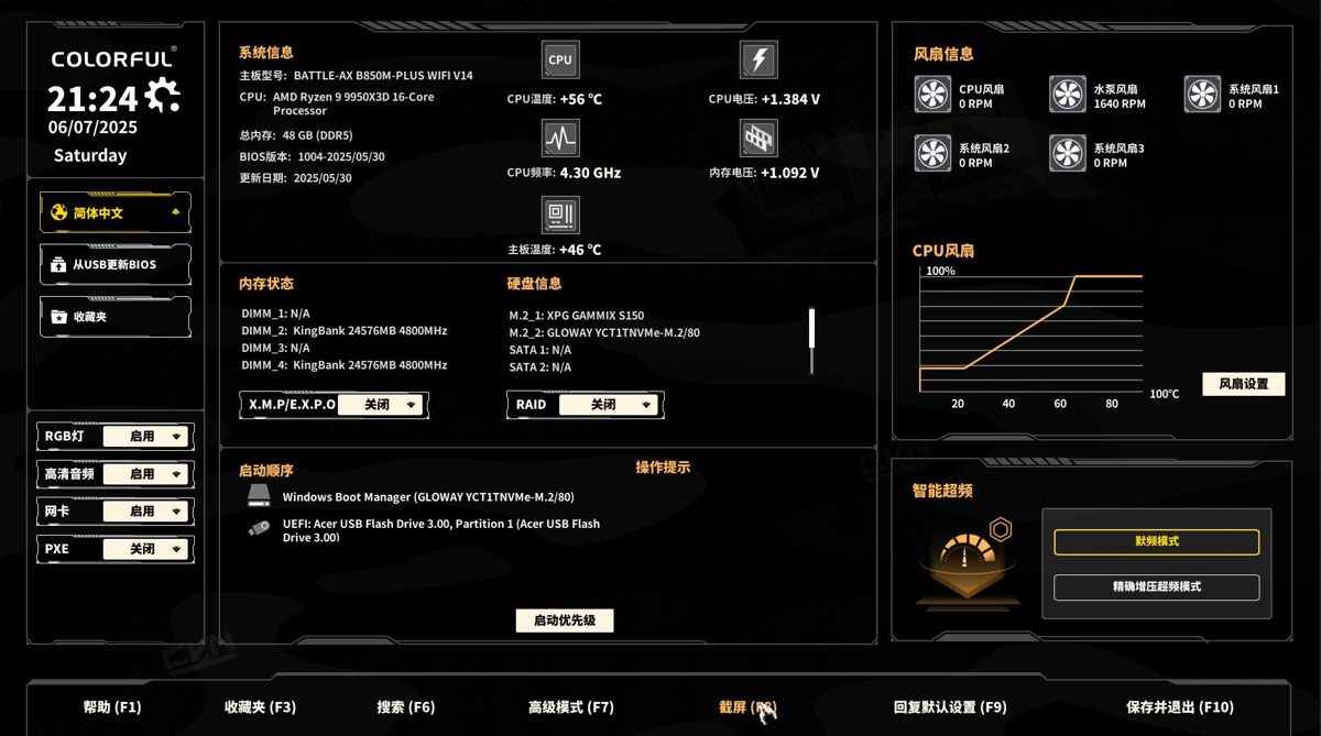主板亮机第 一 步自然是更新 BIOS,该说不说,七彩虹新版的黄黑配色是真亮眼,操作逻辑也很清晰,有种品牌标示度的意思了。