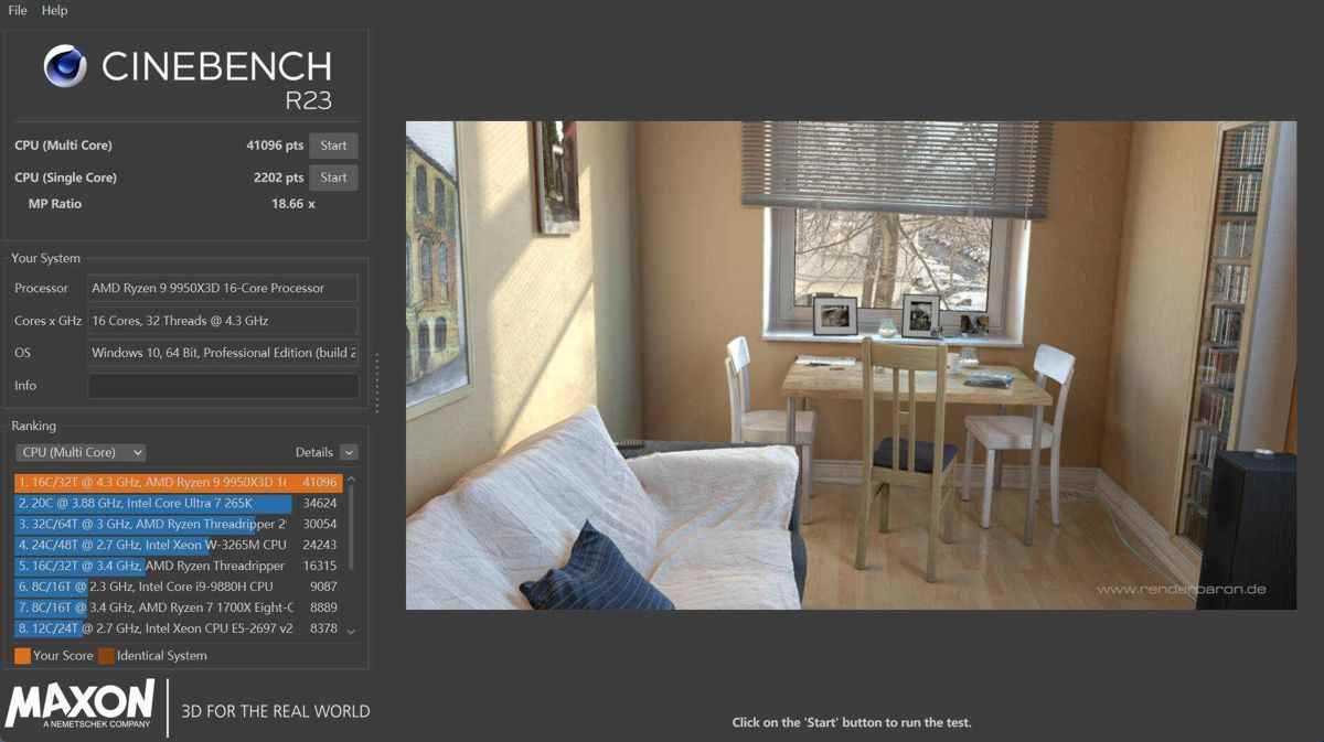 Cinebench R23 渲染测试:作为衡量专业生产力性能的标杆,9950X3D在本平台取得了单核 2202分、多核 41096分 的成绩,结果略低于 X870 平台,但差距不大,说明主板的供电系统在长时间高负载下依然稳如磐石。