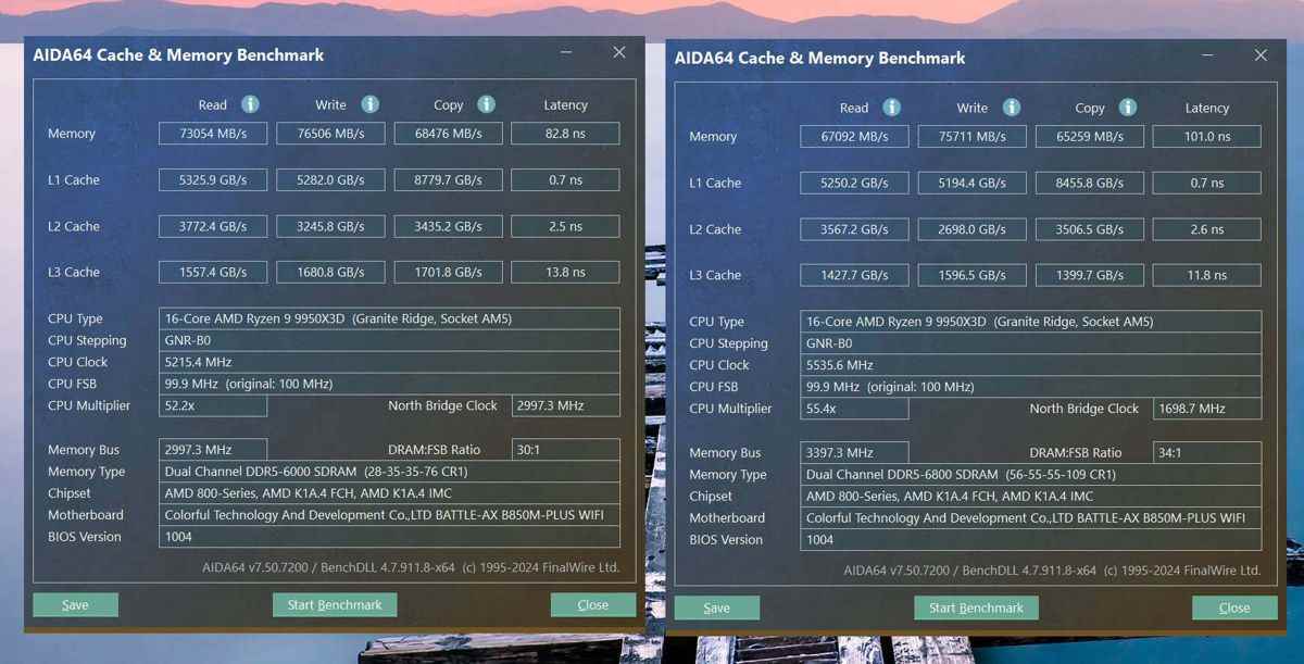 内存测试分别跑了 6000MT/s和 6800MT/s,两者均为 AMD 平台的黄金频率,前者为开启 EXPO 预设,后者则是利用七彩虹主板自动拉取的参数,两者的数据如下