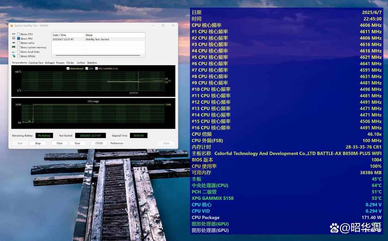 最后看看功耗和散热,不手动提升频率的情况下 AIDA64 FPU 压测 10 分钟,9950X3D 核心频率 4600MHz,CPU 稳定功耗在 174W 左右,处理器温度 64°C(单塔单风扇) 。