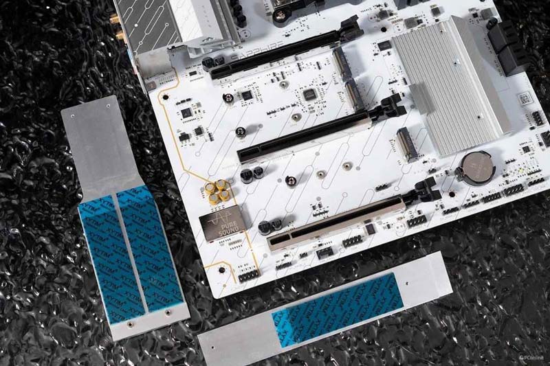 背面也做了白色处理,与正面相得映彰。走线也非常规整,做工同样出色,据介绍,其在内存与PCIe插槽处是采用了成本更高、技术更为先进的SMT贴片工艺,电气性能更佳。