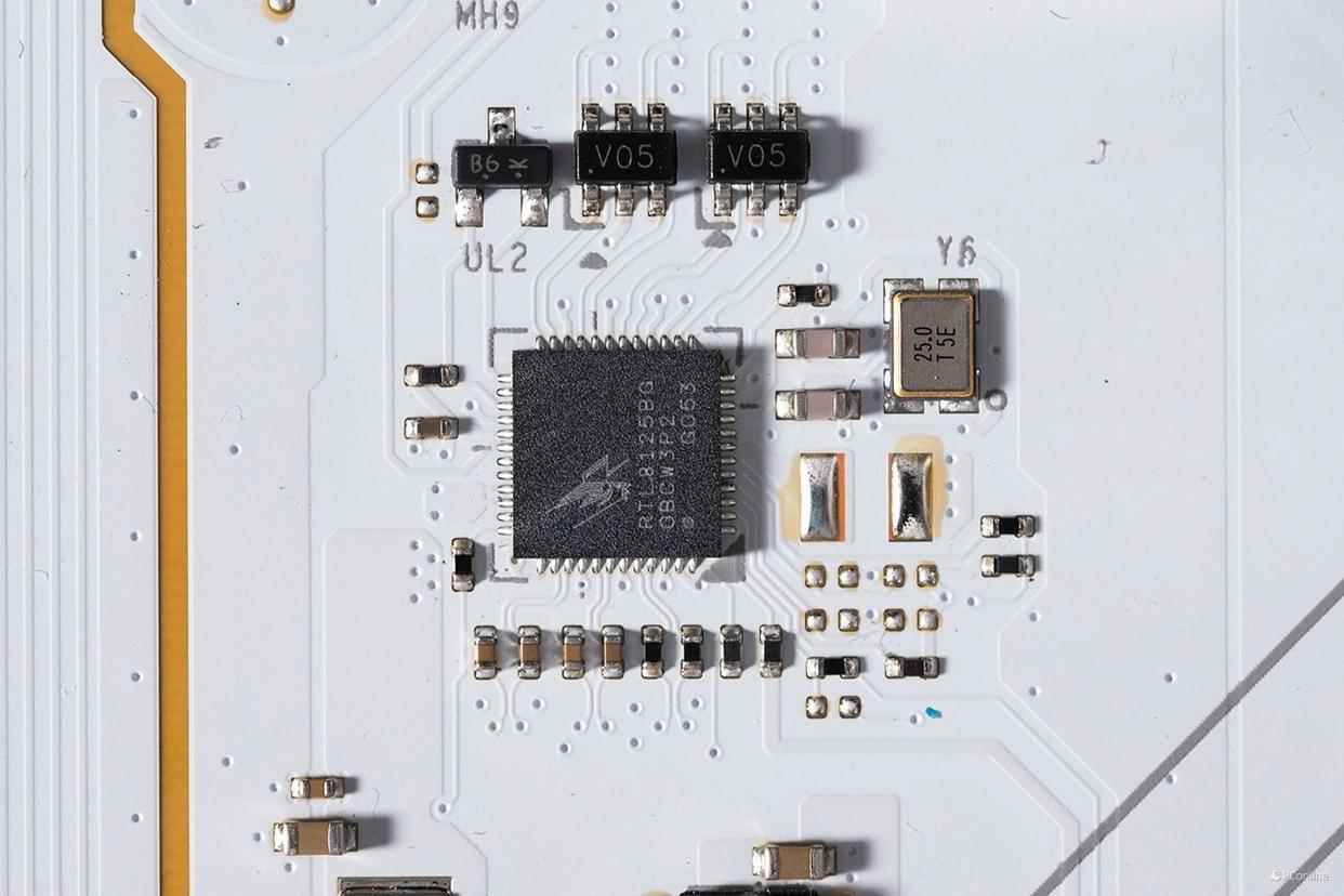 有线网卡芯片则位于声道音频接口下方,同样是Realtek 瑞昱出品,型号为RTL8125BG,带宽是此前千兆网卡的2.5倍。后缀上的这个BG表示该网卡为加强改进版,主要体现在延迟方面,能够进一步降低网络延迟。