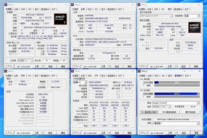 CPU基准测试方面,我们用9800X3D分别在两款主板上进行了测试,实测在蓝宝石PURE极地B850A WIFI主板上,处理器单核得分825.1,多核8527.2;而在蓝宝石PURE极地B850M WIFI上,处理器单核得分826.9,多核得分8492,二者得分均非常出色,完全能够胜任带动9800X3D的重任。