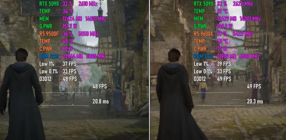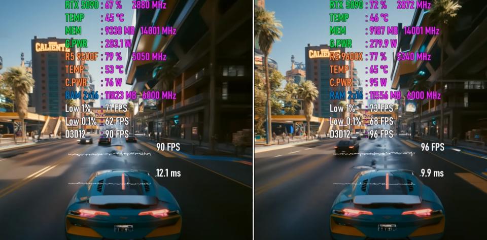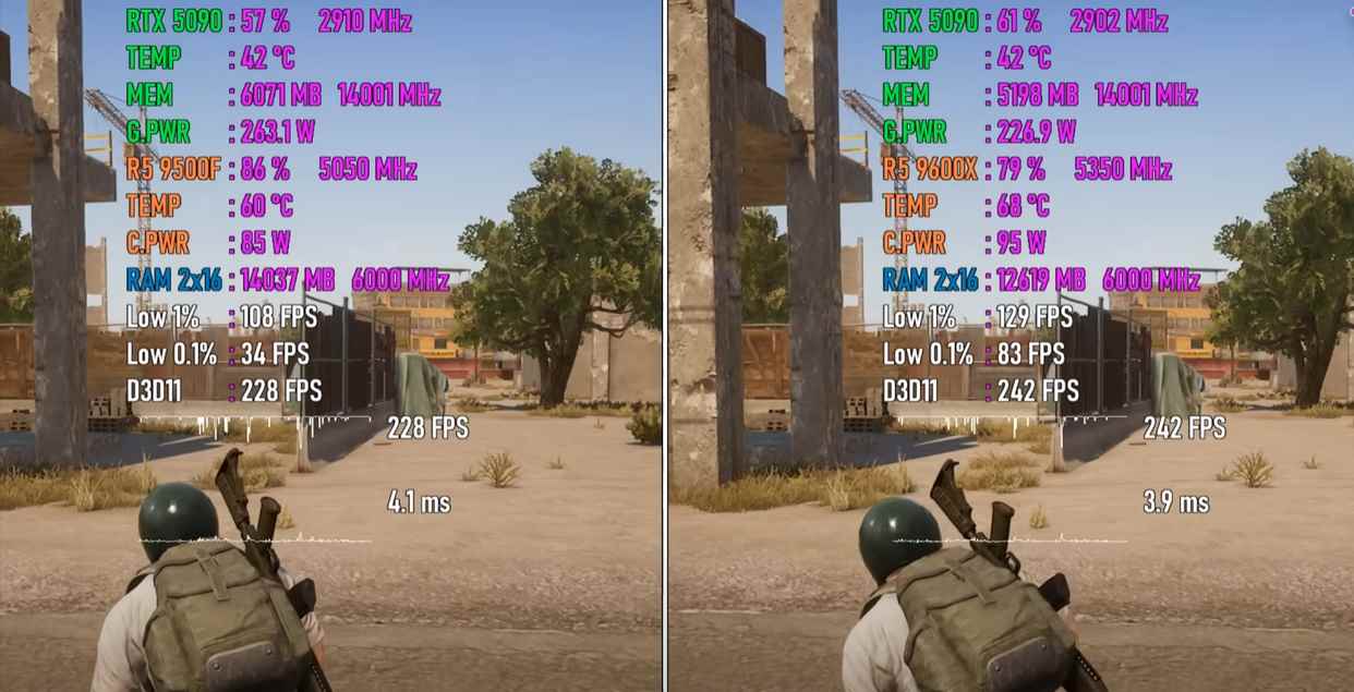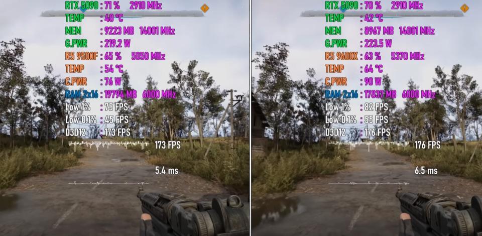 以下将分别测试七款游戏,均采用1080P画质模式,以下系列图片中左边代表Ryzen 5 9500F平台,右边代表Ryzen 5 9600X平台。
