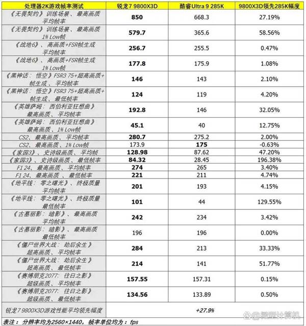 除了以上游戏,锐龙7 9800X3D还在《英雄萨姆:西伯利亚狂想曲》《地平线:零之曙光》《赛博朋克2077:往日之影》与F1 24中的平均帧率、最低帧率或1% Low帧测试中均战胜酷睿Ultra 9 285K,最大领先幅度可达129.55%。后者仅在CS2的1% Low帧测试中小幅领先,并在《古墓丽影:暗影》的最低帧率测试中与锐龙7 9800X3D打平。最终,锐龙7 9800X3D在2K分辨率下的22个项目中赢了20个,1个项目打平,并且在不少游戏中有很大的优势,而酷睿Ultra 9 285K只赢了1个。因此,锐龙7 9800X3D的游戏性能相对酷睿Ultra 9 285K有高达27.9%的平均领先幅度。