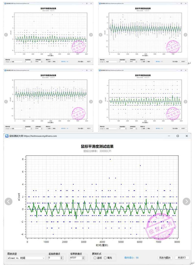 除了这套大基建以外,VT9/VT9 MAX搭载的原相3398传感器(3395高定版本)和原相3950 Ultimate都相对狂暴。以VT9 MAX的原相3950 Ultimate为例,它的DPI高达45000,实际上我们在使用时,超过10000 DPI档位的鼠标,带来的抖动漂移就已经很难掌控了。笔者在普通鼠标垫上,尝试对VT9 MAX的800、1600、3200、6400和30000五个DPI档位分别进行平滑度测试。可以看到在五个DPI档位,VT9 MAX鼠标平滑度表现都是极度优秀。而在30000 DPI和6400 DPI,测试出来的离散点分布几乎没有任何区别,说明这款鼠标在超过6400 DPI的超高敏状态下,性能表现相当一致。