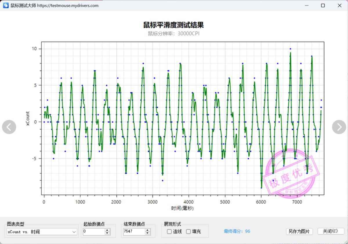 VT9驱动支持高DPI直线修正和波浪修正功能,开启之后可以看到离散点几乎消失,但是受限于笔者水平,平滑曲线还是会有很明显的波动。像我一样普通电竞水平的使用者,想要驾驭这台狂暴引擎,需要相当长时间的练习和更专业的鼠标垫。