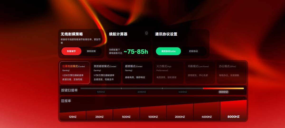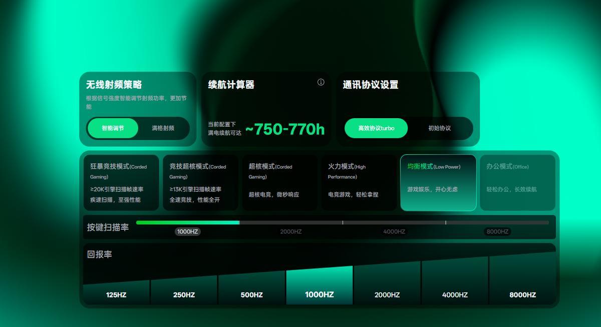 鼠标的性能和续航永远是相互矛盾的。雷柏VT9二代搭载Nordic 54旗舰芯片,并且加入了代号炎龙的雷柏Power+固件技术,而且全系高中低配都支持,让VT9在170元~200元价位很有竞争力。Nordic 54+炎龙新固件这套“组合拳”,带来的优势是无线按键速度更快、续航更长。在相对合理的250Hz低回报率下,可以带来接近1000小时的续航。默认的1000Hz回报率下,可以达成750小时左右的续航。8000Hz回报率下,则是90小时以上,可以说办公/日常/电竞续航都兼顾到位了。在网页驱动-性能模块下,可以看到,VT9有相当多可调节选项, 6种性能档位+4种按键扫描率(MAX独享)+7种轮询回报率相互结合可以适配各种续航需求,还增加了无线射频策略和通信协议策略选项。在进行任何一种策略选择时,续航计算器都会给出当前配置下的满电预估续航,这套玩法相当极客。