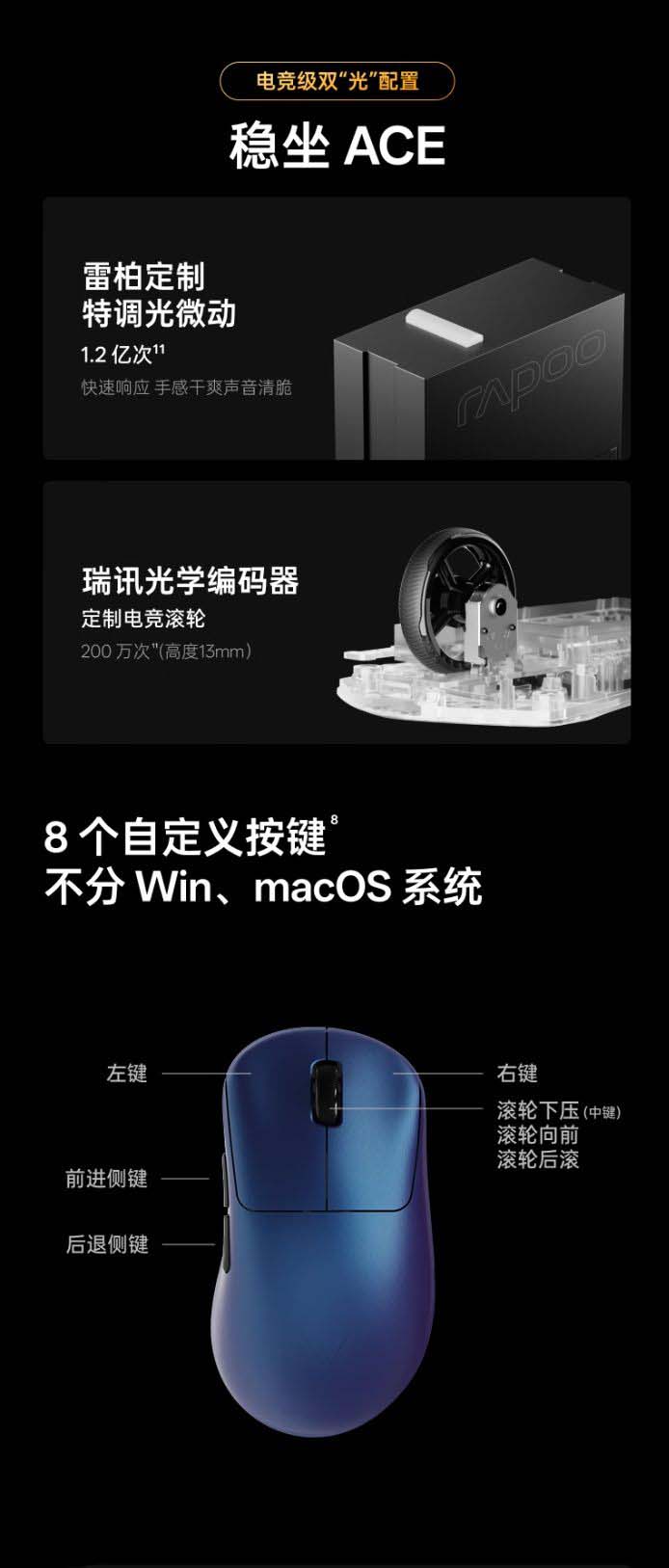 此外,这款鼠标还带有定制特调光微动、瑞讯光学编码器定制滚轮,带有 8 个自定义按键,背部带有 1 个防误触 DIY 独立按键。