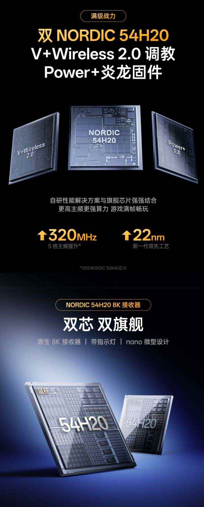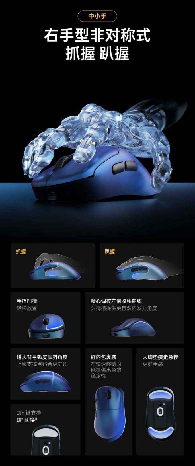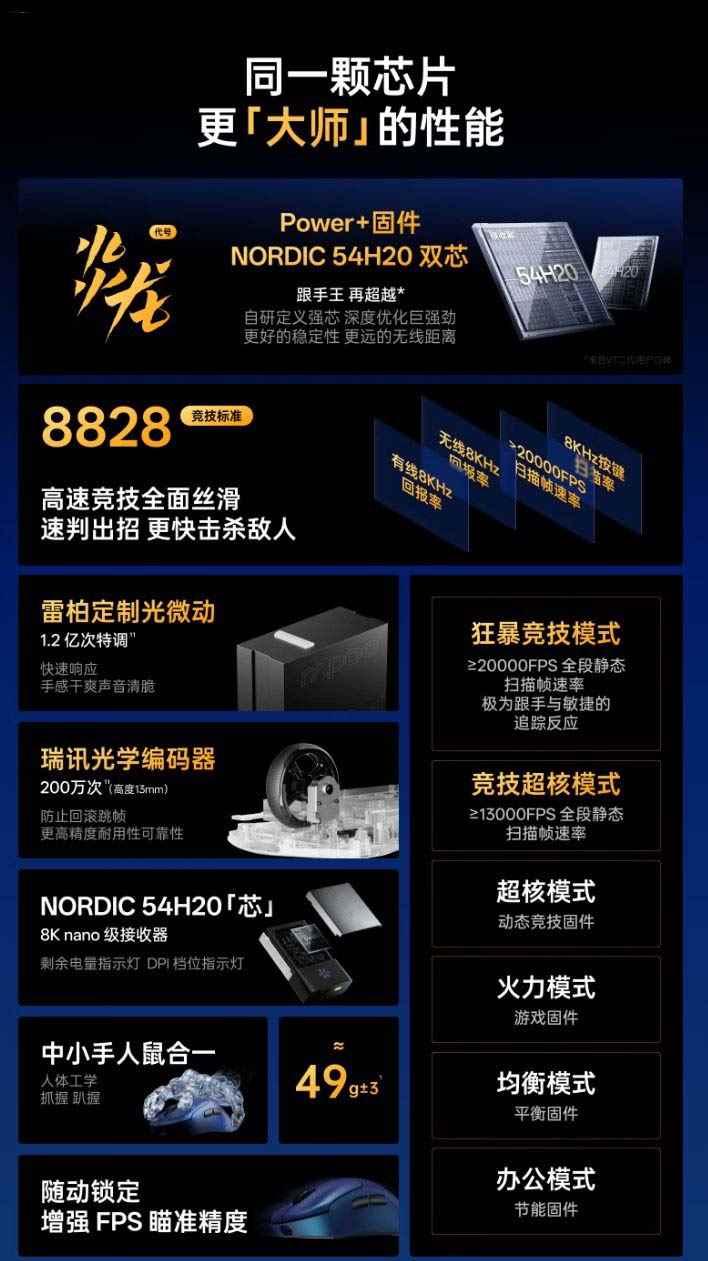 据介绍,该鼠标本体、接收器均搭载 NORDIC 54H20 芯片,具备原生 8K 特性,主频提升至 320MHz,采用 22nm 制程工艺打造,机身适配中小手,支持抓握、趴握两种握持姿势,带有手指凹槽、瘦腰曲线、大脚垫等人体工学设计。