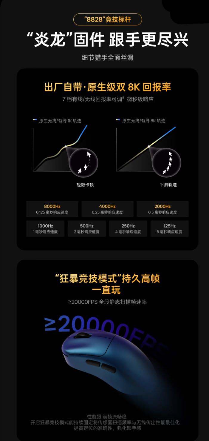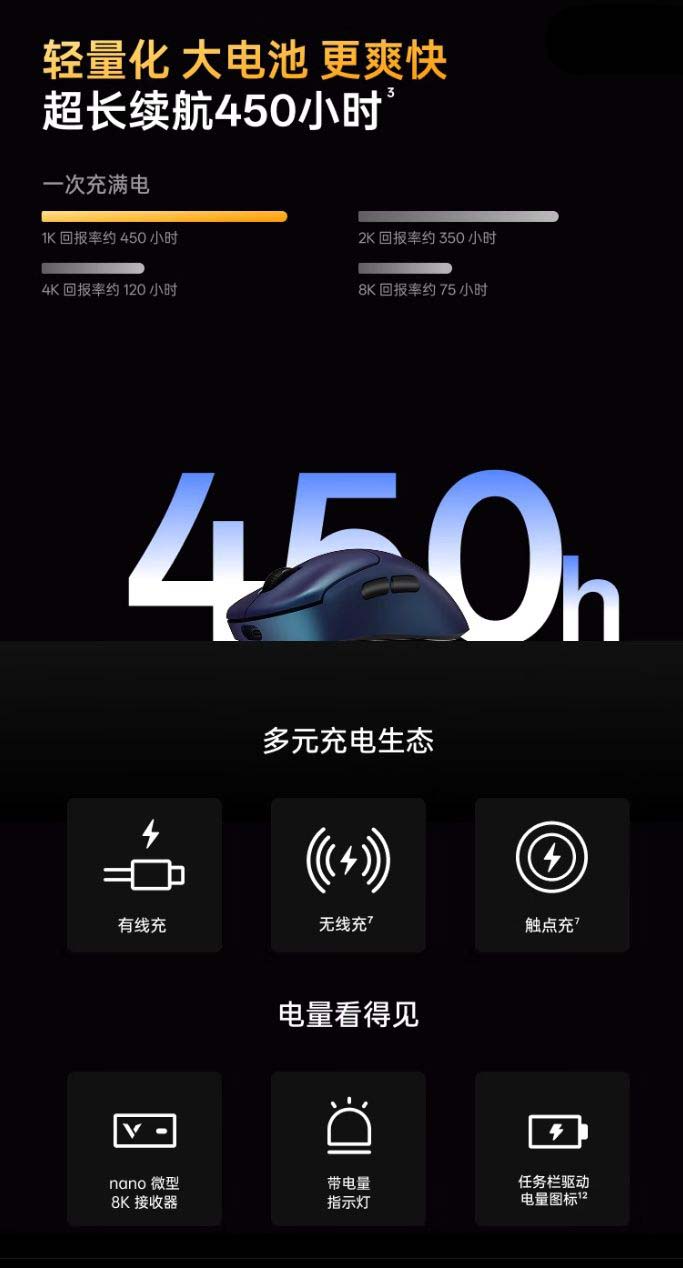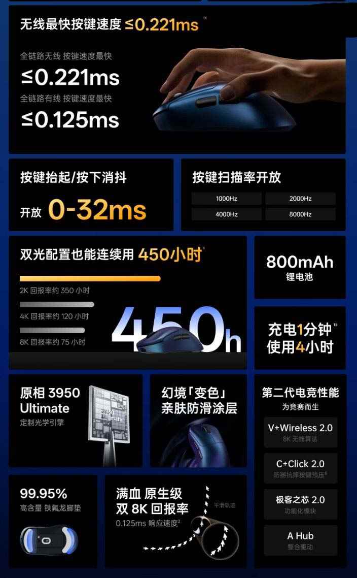 规格方面,这款鼠标搭载“炎龙”固件,最高支持 8KHz 按键扫描率,支持 V+Wireless 2.0 无线技术,最长续航可达 450 小时,支持有线充、无线充、触点充三种充电生态,配备原相 3950 Ultimate 传感器,可更精准地捕捉像素点细微变化。