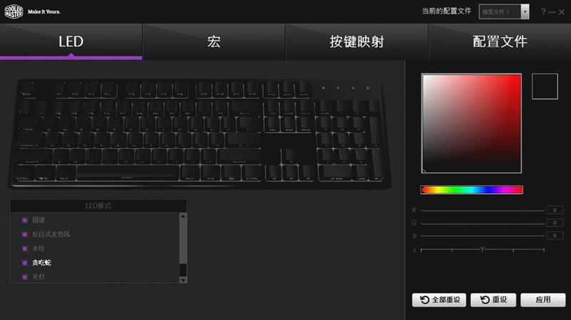 作为一款酷冷至尊RGB键盘,我们可以通过官网下载驱动,从软件上来看,非常简单,分别是LED灯光、宏编辑、按键映射与配置文件,相信都不难理解,宏编辑和按键映射多数用在游戏上。