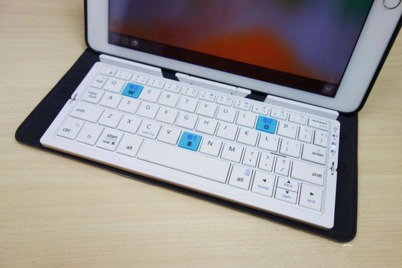 别小看这款蓝牙键盘,古语有云:麻雀虽小五脏俱全。这款B.O.W 航世 HB199 折叠蓝牙键盘的按键材质是ABS的,每一粒按键在敲击的时候,给手指的反馈是非常轻柔的,就像巧克力键盘一样。我们再来细看一下键盘的每一个按键上面蓝色的多功能标注,多功能快捷按键可以说给了键盘给多的命令,这让我们在外出办公时,不至于嫌键盘小,而缺失了很多的功能键。在键盘的右顶端,从上至下依次是电源指示灯,蓝牙123指示灯,灯小而不刺眼。