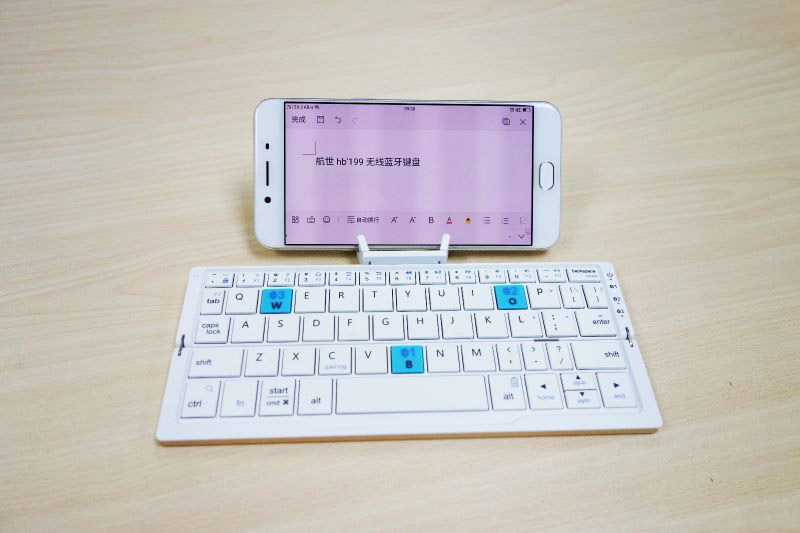 千呼万呼始出来,从上向下翻折一下,我们就能看到这款超级便携的航世HB199的庐山真面目了。键盘的格局是采用标准的键盘格局,键盘的按键上做了很多天空蓝的标注,其中最引人注目的是WOB这三枚按键,它们三者使用了天空蓝的按键键钮,为何选择它们三呢?组合一下,B.O.W 航世 ,其实就是航世品牌的英文简称。