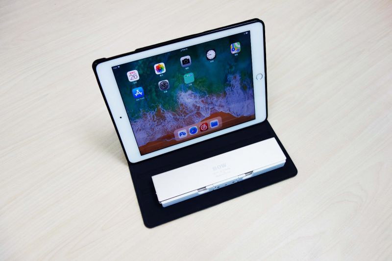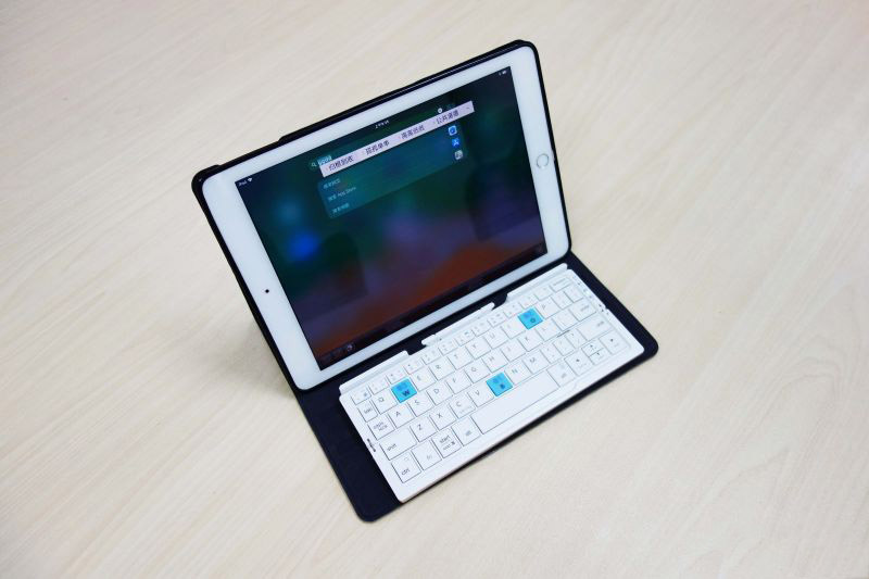 笔者的平板是在京东购买的,具体型号是iPad2 air 2,屏幕尺寸大小事9.7寸,从照片中我们可以看到键盘的长度还没有ipad长。放置在平板皮套上的键盘可以说是恰如其分,两者双剑合璧。