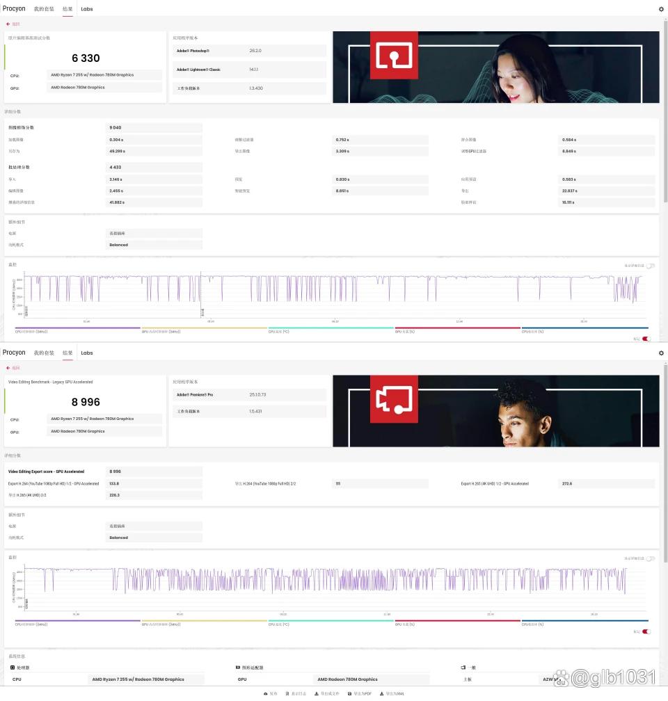 Procyon的Adobe PS、LR以及PR测试分数成绩如图,我对比了我之前测试的8875HS版本的零刻SER8 的测试成绩,可以看到零刻 SER9 Max的表现都有不小的提升。同样在照片处理性能上与230F成绩相当,但是视频编辑方面之前的230F处理器搭配是RTX 5070显卡,所以在PR视频编辑上SER9 Max的成绩并不如之前的主机。