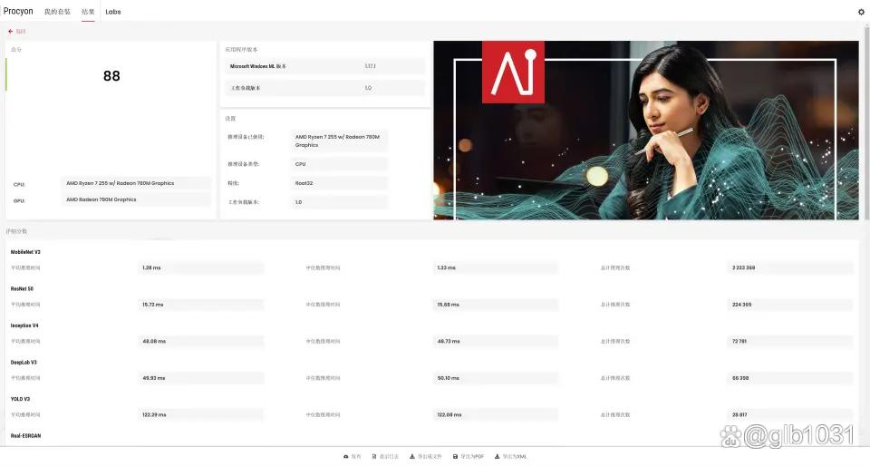 在UL的Procyon的Microsoft Windows ML版本的测试中Float 32的CPU处理器测试成绩为88,虽然处理器的Float 32的CPU测试成绩要略低于桌面平台的9600X,但是性能表现我觉得还是符合预期的。