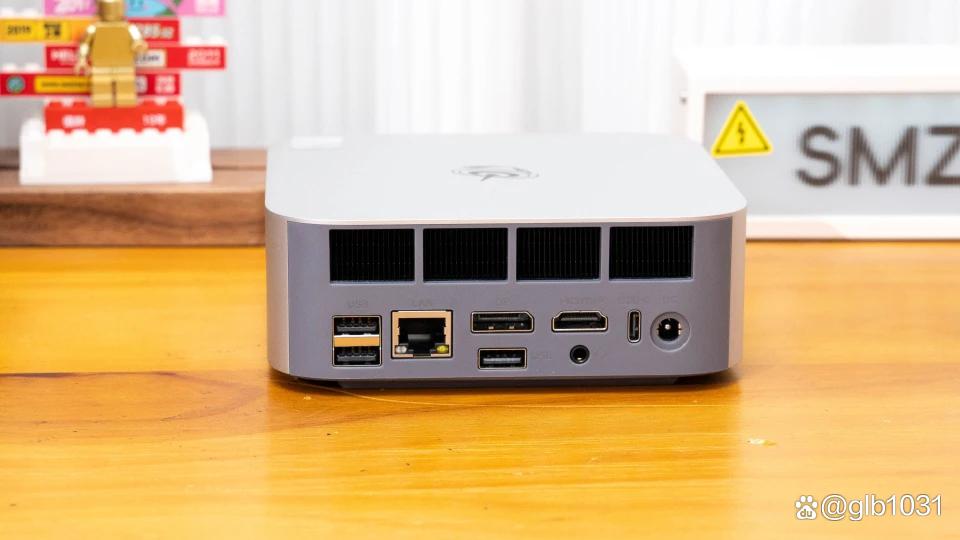 最值得说的就是这次零刻 SER9 Max升级的万兆网口了,其他接口规格还是和前代SER 8一致。三个USB-A 接口方便扩展,一个USB-A 3.2 10Gbps 两个USB-A 2.0 接口,DP 1.4和HDMI 2.1 视频输出接口最高支持4K 240Hz高刷,USB4 40Gbps Type-C 接口和圆形的DC 电源供电接口。