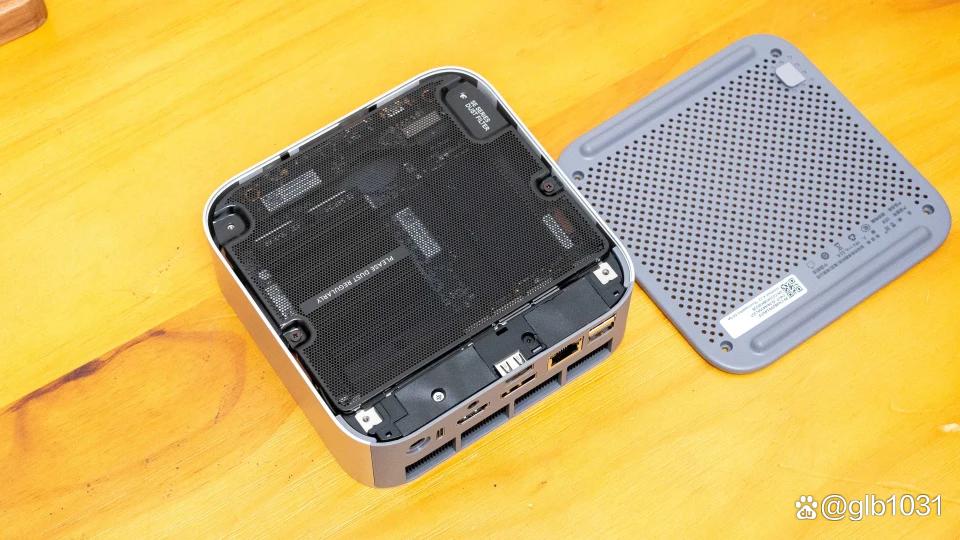 底部设计了双层防尘设计,底部首先是一侧塑胶底座。整机拆机升级并不复杂,如果你选择准系统版本的话就需要自己拆开安装内存和SSD才能使用了。