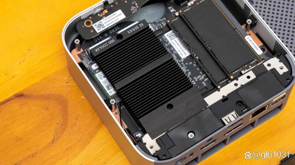 打开后就可以看到内部的双DDR5 笔记本内存和M.2 硬盘的安装位置。当然最「卷」的还是零刻,为玩家提供了硕大的M.2 散热盔甲来帮助散热。这点上真的「卷」。