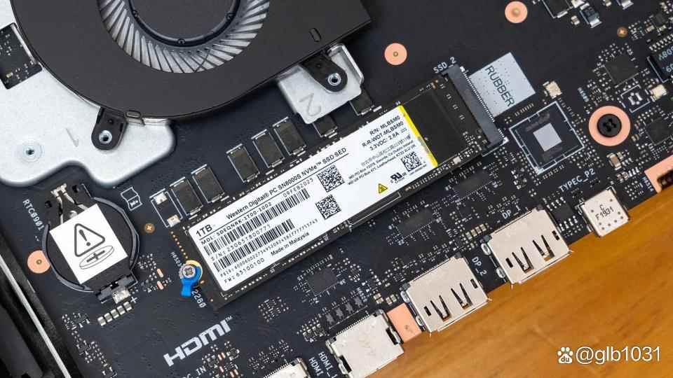 拆下散热片之后,可以看到下方的M.2 SSD是来自西部数据的SN8000S,容量1TB。通过测试可以看到这是一款PCIe 4.0 SSD产品,不过根据官方参数介绍,这个M.2 SSD是支持PCIe 5.0 x4技术规范的,支持安装2280规格M.2 SSD。