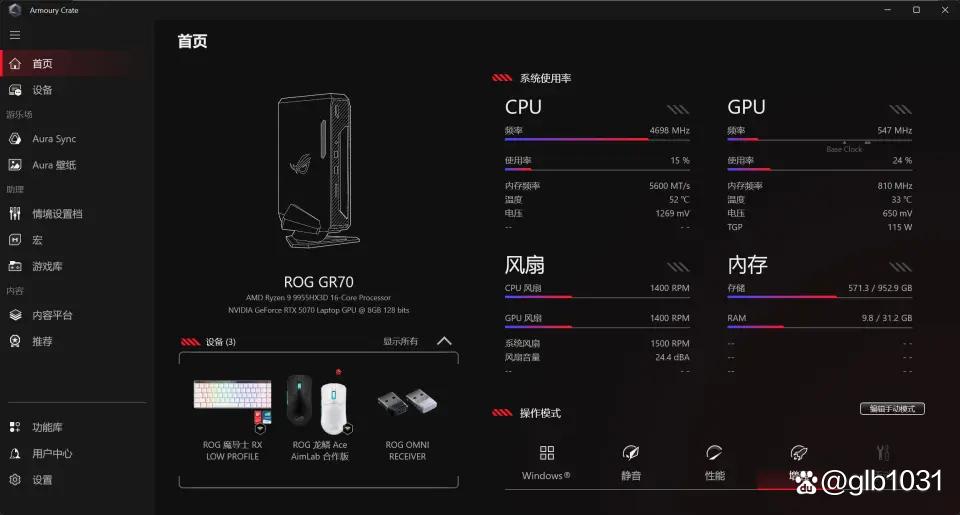 首先可以通过奥创软件查看ROG 魔霸9 MINI主机的具体配置,并根据需求可以设置Windows、静音、性能、增强以及手动5种操作模式。