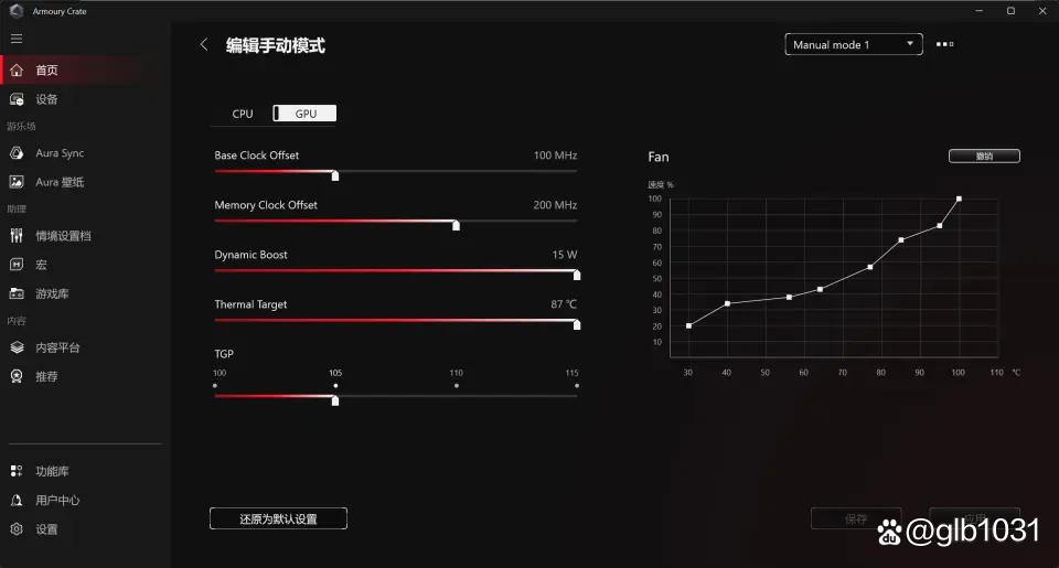 手动模式下,玩家可以针对处理器与显卡手动调整频率与风扇转速的参数。整体可玩性还是符合ROG系列产品一贯的定位的。