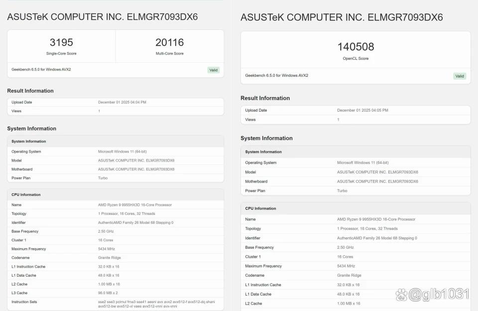 Geekbench 6测试9955HX3D处理器与5070显卡成绩。
