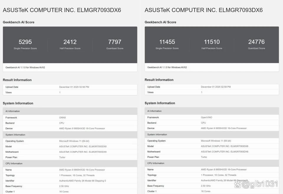Geekbench AI测试中9955HX3D处理器的ONNX与OpenVINO的测试成绩如图,大家可以对比一下自己手中的处理器成绩参考一下。