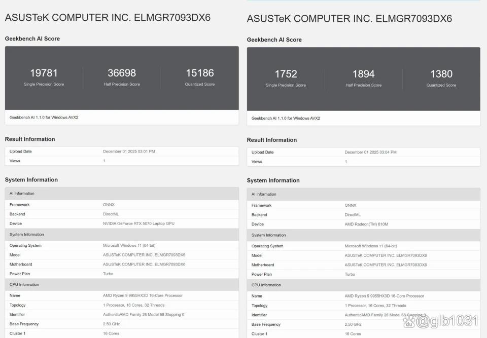 RTX 5070 Laptop显卡对比610M核显的 ONNX AI测试成绩参考。